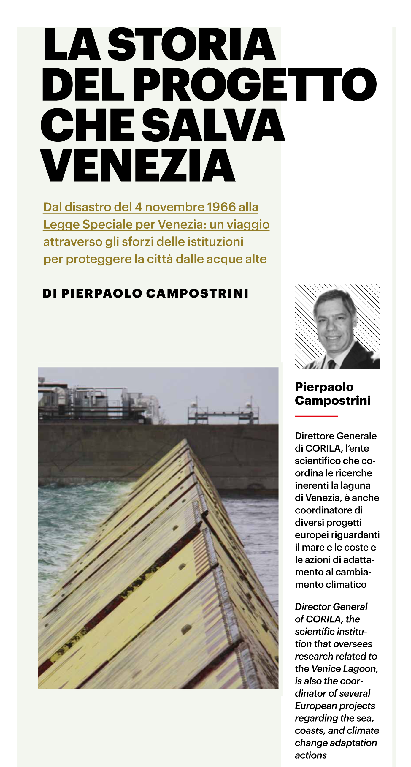 Eng. Pierpaolo Campostrini, director of CORILA, contributed to the drafting of the special issue with an article (on page 50-51) that concerns the history of the MOSE project, from the 1966 disaster to the Special Law for Venice, retracing all the efforts made to defend the city.