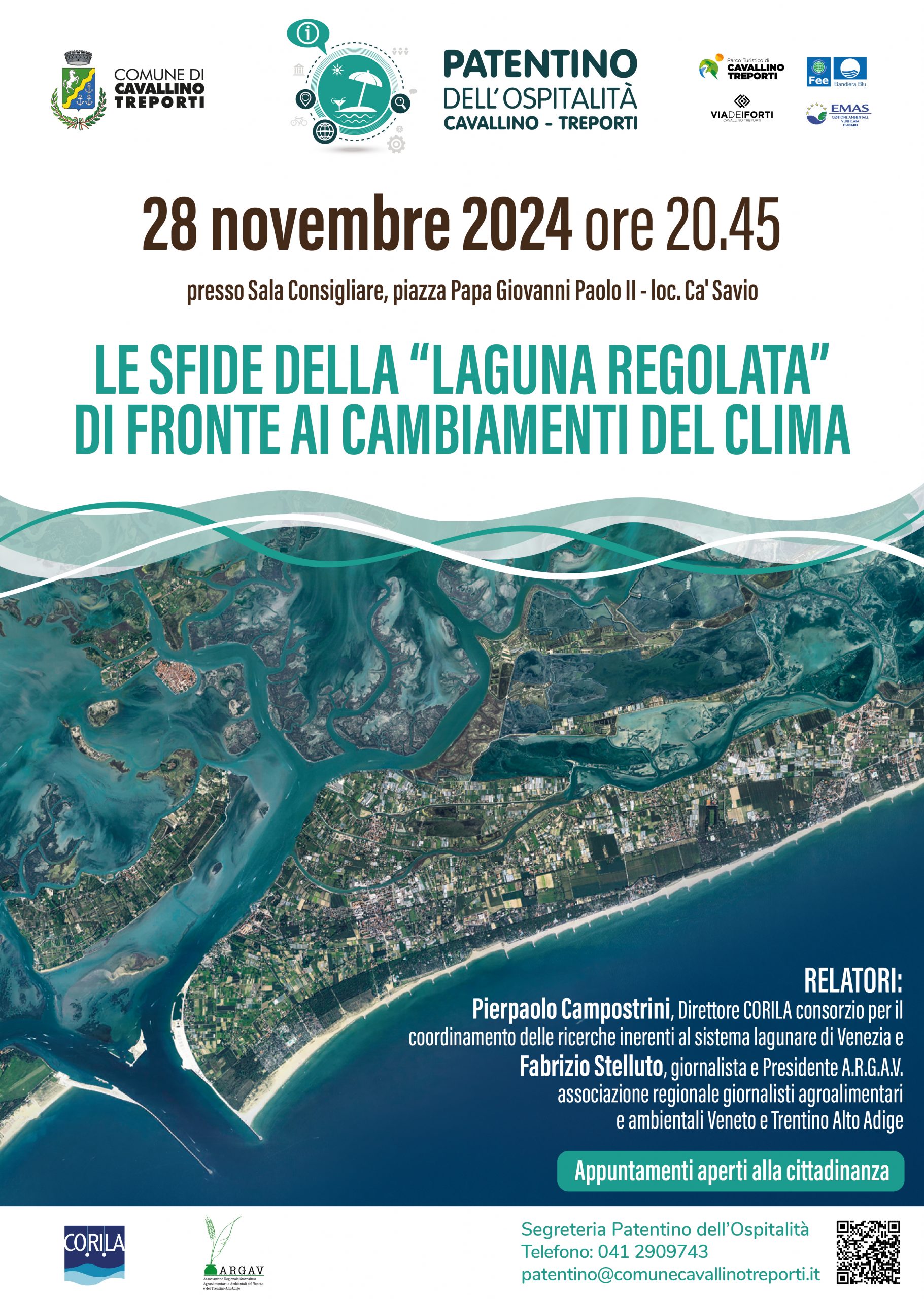 GIOVEDI 28 NOVEMBRE ORE 20.45 La cittadinanza è invitata a partecipare all’incontro: “Le sfide della “laguna regolata” di fronte ai cambiamenti del clima” che si terrà presso la Sala Consigliare G. Paolo II – loc. Ca’ Savio.