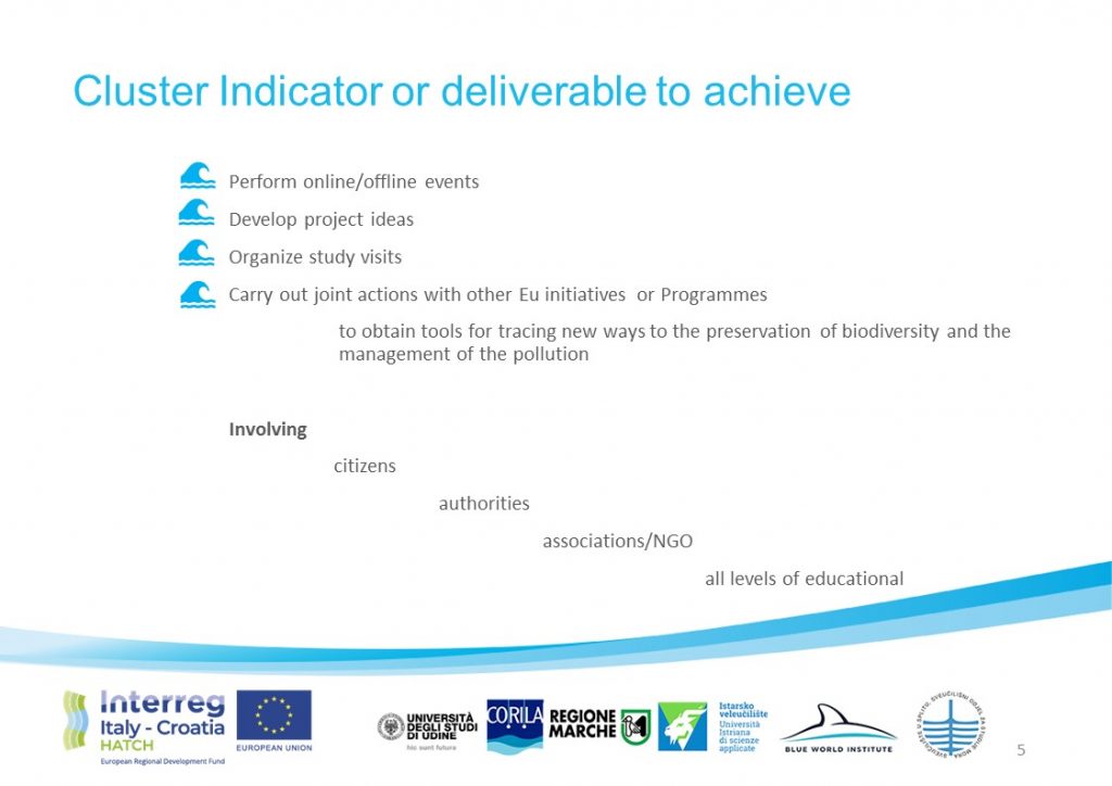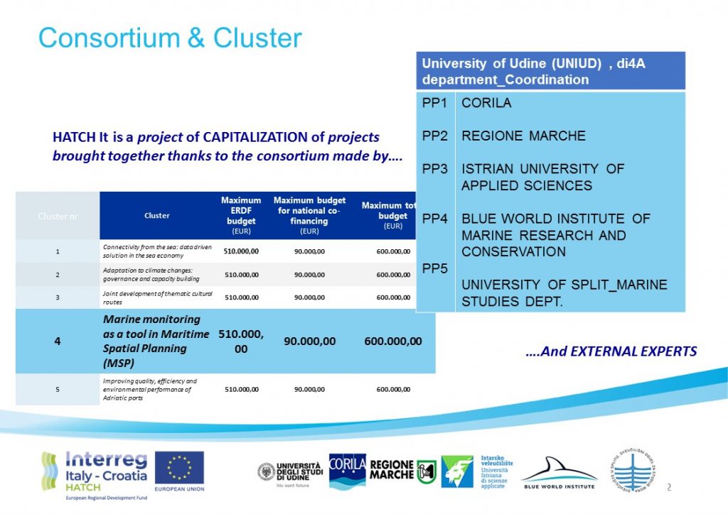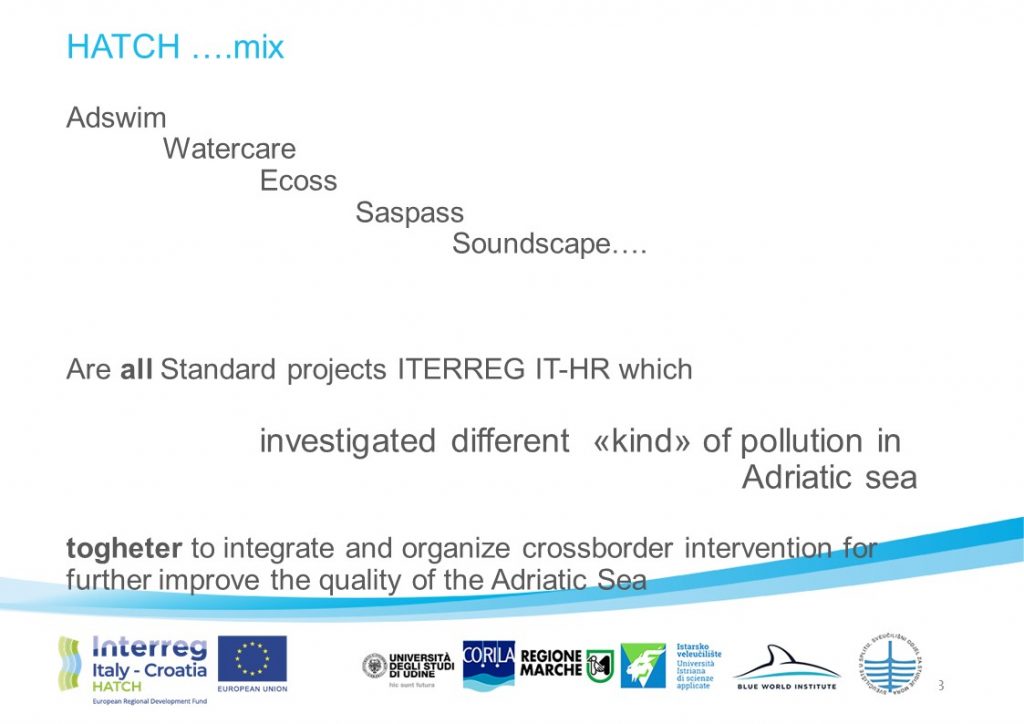 HATCH risponde a una “cluster call” il cui obiettivo è massimizzare le esperienze e i risultati raggiunti dai progetti Standard Interreg IT-HR. Il cluster intende partecipare alla diffusione della metodologia di Pianificazione dello Spazio Marittimo (PSM) per l’utilizzo del Mare Adriatico. L’obiettivo principale della PSM è integrare la protezione dell’ambiente marino con l’uso economico e ricreativo. Offrire strumenti per razionalizzare l’uso delle risorse e pianificare l’uso dello spazio marino per sostenere la crescita economica ma anche per salvaguardare l’ambiente e i suoi habitat risponde a un’esigenza sempre più sentita sia dagli stakeholder politici che da quelli tecnici.