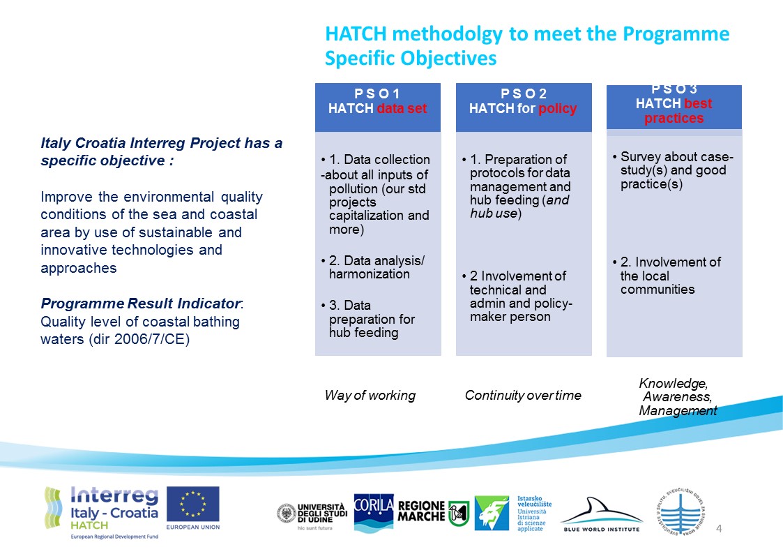 - HATCH intende fornire strumenti utilizzabili dagli stakeholder e dai decisori nell’applicazione della PSM per la conservazione del mare Adriatico.In questo quadro, i partners coinvolti nel consorzio HATCH intendono capitalizzare i dati raccolti con le attività di analisi e monitoraggio svolte durante i loro progetti STD (Adswim, ECOMAP, ECOSS, CREW, SASPAS, SOUNDSCAPE, Watercare) analizzarli, confrontarli e organizzarli in un unico formato al fine di caricarli in un’unica piattaforma (Hadriaticum Hub) che sarà resa disponibile a livello transfrontaliero come supporto al processo decisionale per l’implementazione della PSM.Verranno inoltre predisposti protocolli e linee guida per manipolare questi dati, nonché per organizzarli in modo armonizzato, anche per offrire procedure metodologiche condivise per accelerare i processi di mappatura e di popolamento di questo hub di dati. Vengono inoltre raccolti, razionalizzati e condivisi a livello transfrontaliero i casi di Best Practice dei progetti passati.Questi outputs possono contribuire alla gestione adattiva della pianificazione e corrispondono ad alcuni dei punti chiave su cui si basa la PSM: cooperazione transfrontaliera, incorporazione del monitoraggio e della valutazione nel processo di pianificazione, concettualizzazione di fattori abilitanti per le decisioni basate su informazioni chiare e conoscenze scientifiche.Grazie ad adeguate strategie di divulgazione, saranno presentati agli stakeholder (dall’amministrazione locale al pubblico in generale, agli studenti) che potrebbero essere coinvolti nella loro adozione.Ciò dovrebbe sostenere la PSM, ma anche suggerire usi più verdi e sostenibili del mare.
