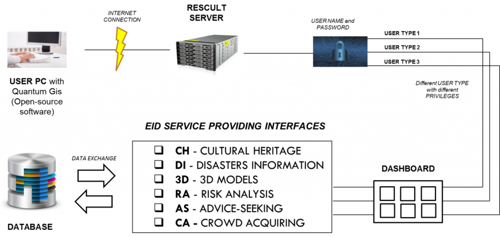 - Una interfaccia di aiuto e assistenza per le azioni e pratiche da adottare e intraprendere in specifici casi di disastri, ad utilizzo della Protezione Civile;