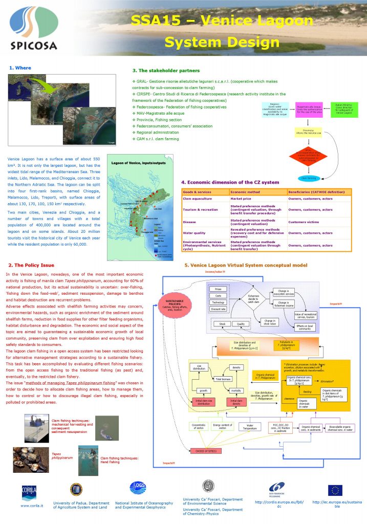 SPICOSA è un IP-Integrated Project sul tema Integrated Coastal Zone Management – ICZM, in accordo con la tematica 6.3 “Global Change & Ecosystems” finanziato dai fondi del VI Programma Quadro della Comunità Europea. SPICOSA si pone come fine principale sviluppare una ricerca multidisciplinare, fornire gli strumenti per uno sviluppo sostenibile dell’ambiente costiero, attraverso una considerazione bilanciata degli aspetti ecologici, sociali e economici secondo gli obiettivi del Coastal Zone (CZ) Systems. Per perseguire questo traguardo, il progetto intende acquisire le metodologie scientifiche necessarie per capire e quantificare le risposte degli ecosistemi costieri, in una visione integrata con le attività economiche e sociali e le loro conseguenze, quando questi ecosistemi sono soggetti a cambiamenti ambientali ed antropici sia locali che globali. I risultati ottenuti saranno valorizzati incentivando la condivisione delle ricerche effettuate, la cooperazione tra i fruitori finali, e la promozione di una politica di divulgazione e promozione delle metodologie di gestione ottenute. SPICOSA è un consorzio a cui aderiscono 54 partners, tra Università, Istituti di Ricerca, Piccole Medie Imprese, JRC e CORILA, tutti operanti nella ricerca ambientale e gestionale delle aree marine costiere europee, di questi 18 sono usati come Study Site, per lo sviluppo di metodologie operative in questo settore. Il CORILA come Stakeholder, si pone come partner gestionale, scientifico ed amministrativo per lo Study Site della Laguna di Venezia, con il ruolo di coordinatore dell’attività scientifica che verrà svolta nell’ambiente lagunare Veneziano, e come referente amministrativo e gestionale del Comitato Guida in questa zona di studio. xxx SPICOSA – FP6 2007-2011
