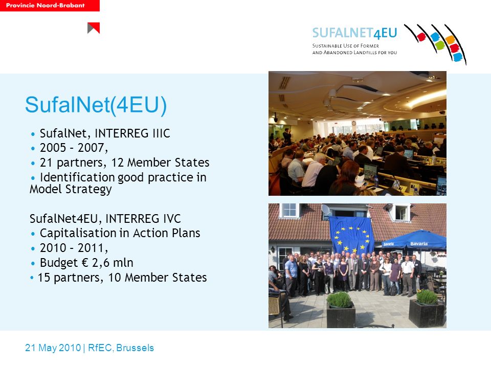 WEB SITE È un network del programma europeo INTERREG III C West Zone, avente ad oggetto il tema delle discariche non più in attività sia in ordine ai problemi di rischio per l’ambiente e per la popolazione, che delle opportunità di riutilizzo dei materiali e delle aree. Il progetto iniziò nel gennaio 2005 e durò 36 mesi, con un budget complessivo di Euro 1.324.200,00. SUFALNET Partners